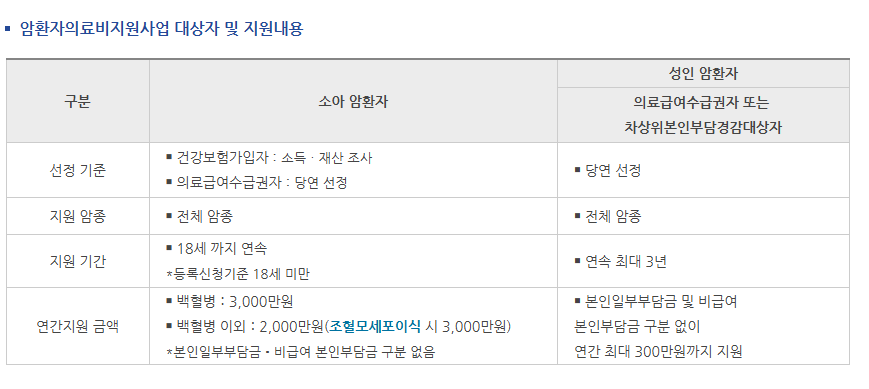 - 소득/재산 기준 충족 시 치료비 일부(연간 한도) 보조.