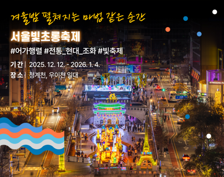 - 서울빛초롱축제(청계천·우이천): 12/12 ~ 1/4 · 18:00~22:00 · 무료