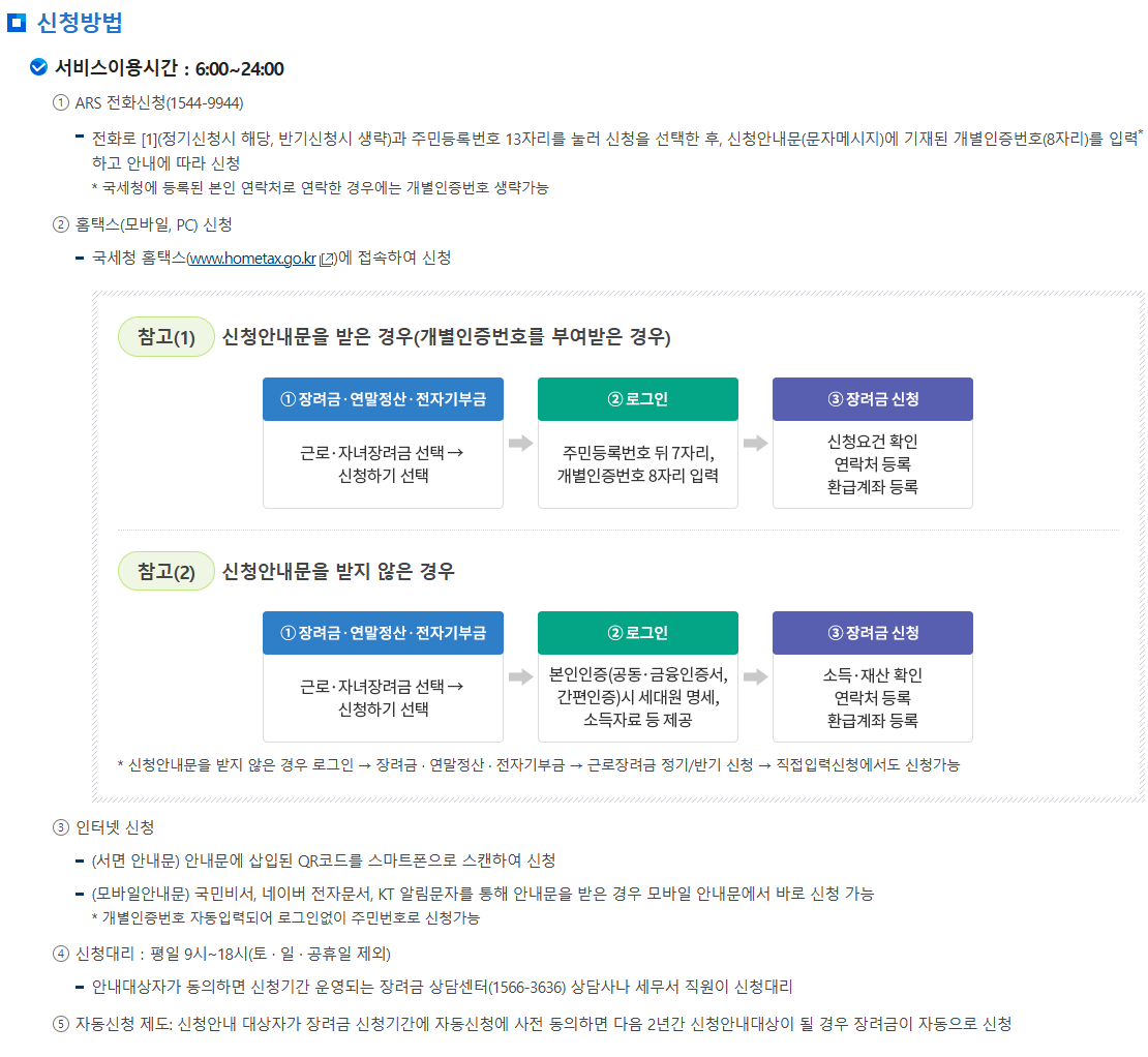 - 대상: 2024년 소득에 대한 근로장려금 수급 조건을 충족했지만 제때 신청하지 못한 자