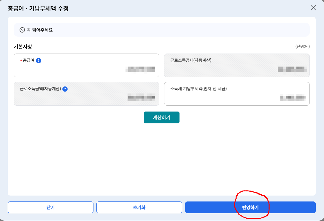 - 입력 완료 후 “계산하기” 클릭 → 예상 납부세액 또는 환급금(연말정산 기준) 결과 확인