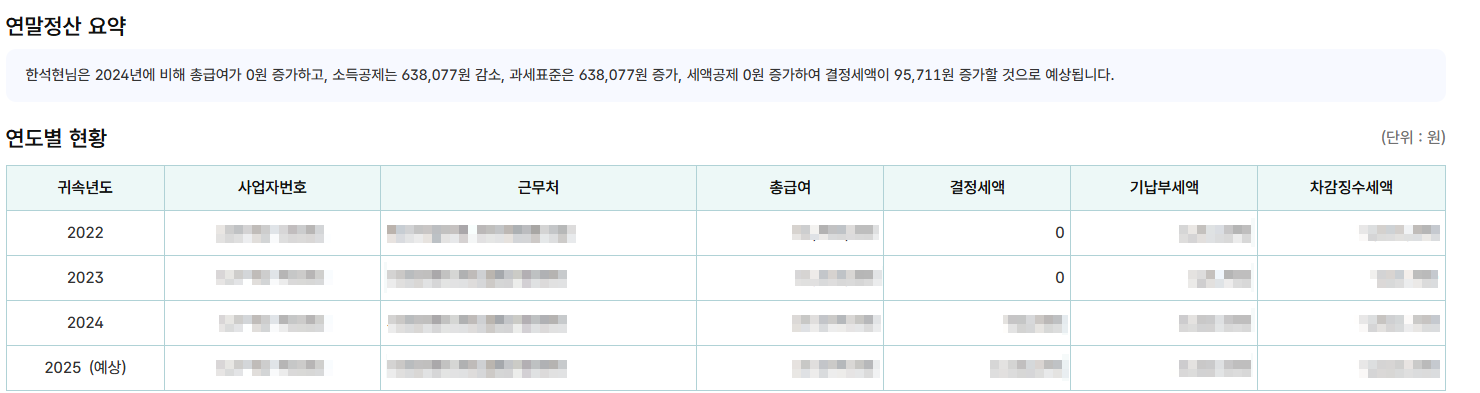 - 최근 3년간 총급여·공제금액·결정세액 증감 추이 그래프 제공