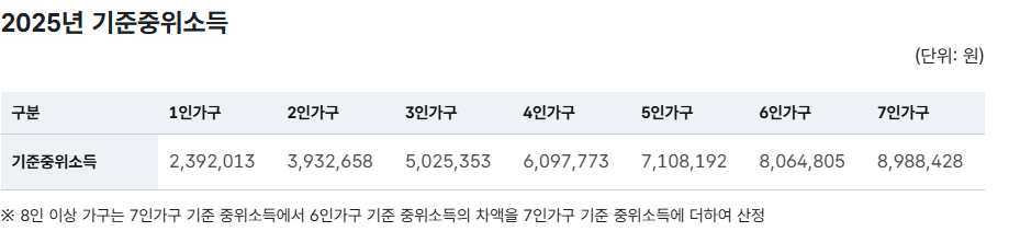 - 임차가구의 경우 임차료 일부 지원이 제공됩니다. 예컨대 서울 4인 가구 기준 최대 약 52만 원/월 수준까지 지원된다는 안내가 있습니다.