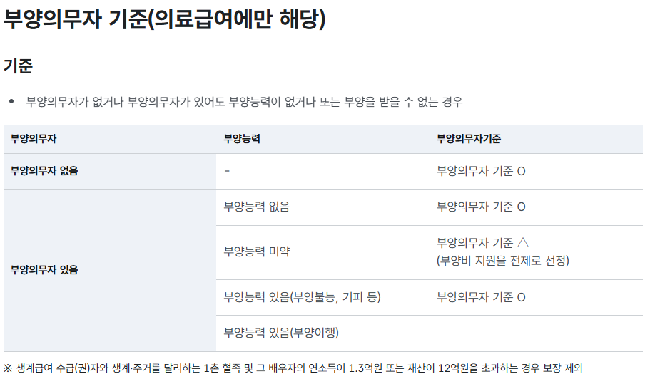 - 다만, 부양의무자 연소득이 1억 원 이상 또는 재산이 9억 원 이상인 경우에는 제한될 수 있었다는 점은 참고해야 합니다.