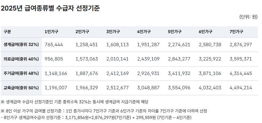 - 2025년 기준으로 생계급여 최고선이 인상된 점이 특징입니다.