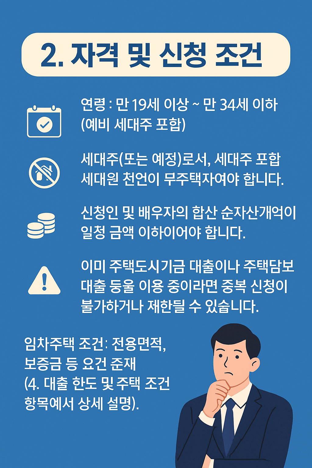 - 임차주택 조건: 전용면적, 보증금 등 요건 존재 (「4. 대출 한도 및 주택 조건」 항목에서 상세 설명).