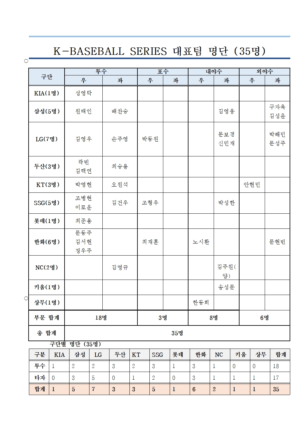 ※ 투수 18명, 포수 3명, 야수 14명 구성