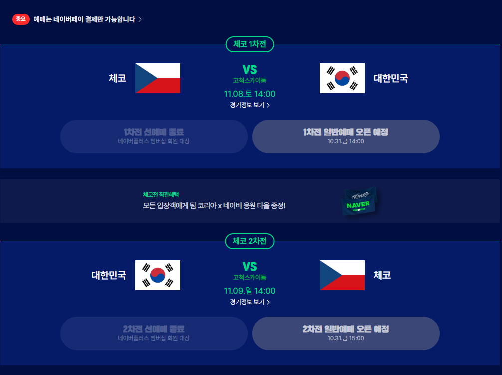 - 체코전 1차전: 11월 8일(토) 오후 2시