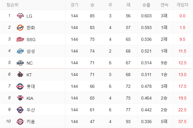 현재 10월 기준 1위 LG, 2위 한화, 3위 SSG, 4위 삼성, 5위 NC 인데, LG는 한국시리즈 직행이 유력하고, 한화도 PO진출이 안정적일 것으로 보입니다. 3위~5위 팀은 준PO와 와일드카드 경쟁이 치열할 것 같네요